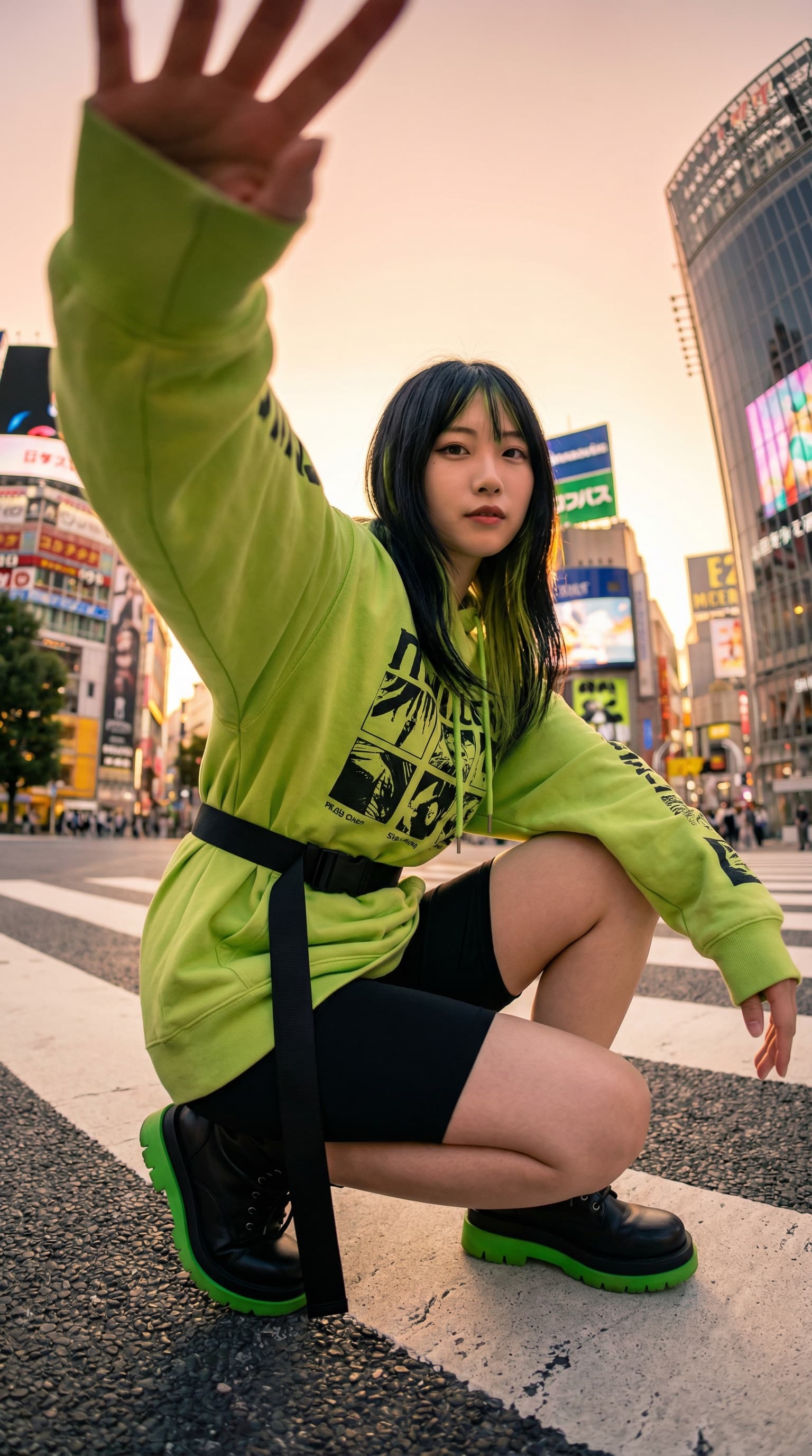 A young woman in a vivid green hoodie crouches in a Shibuya crosswalk, hand outstretched toward the viewer. The image...