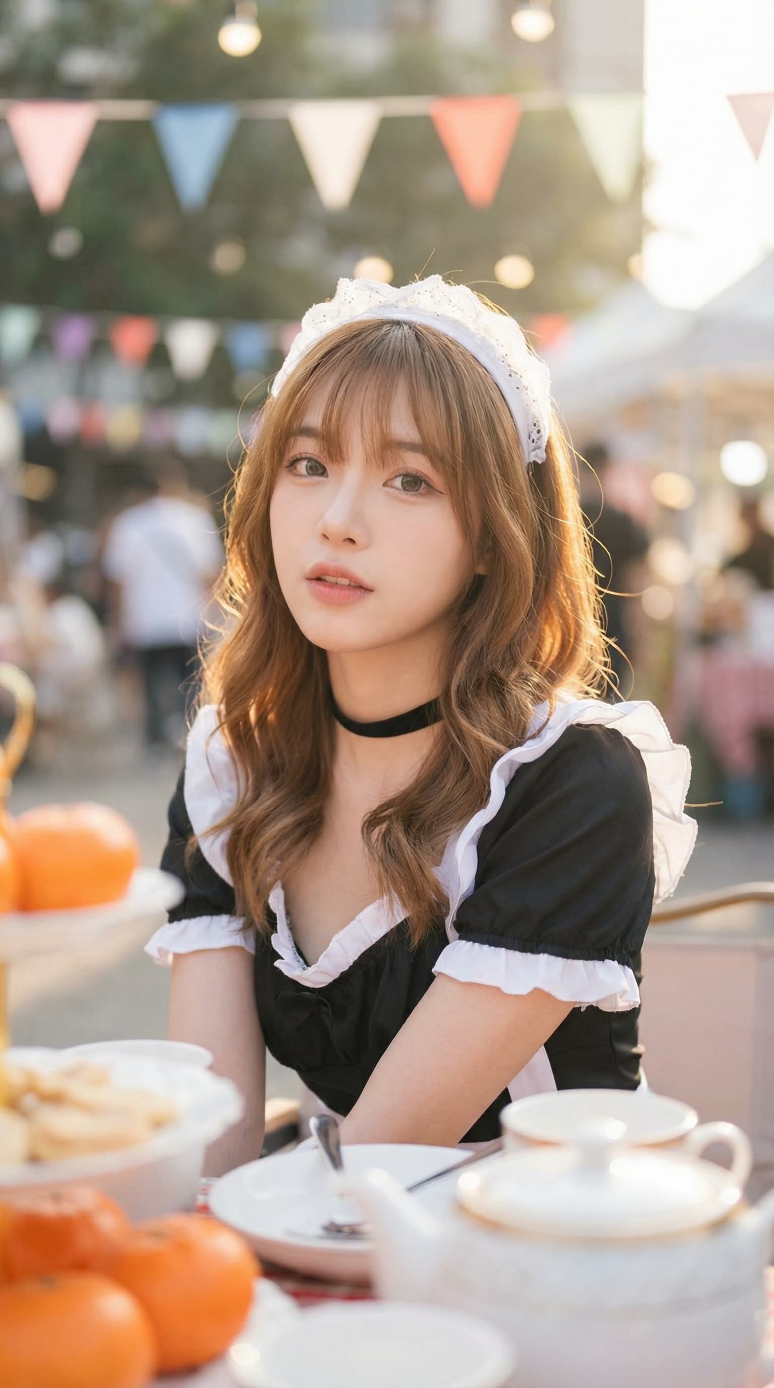 A young woman in a maid costume sits at a tea table in an outdoor market, bathed in soft golden light. The image evok...