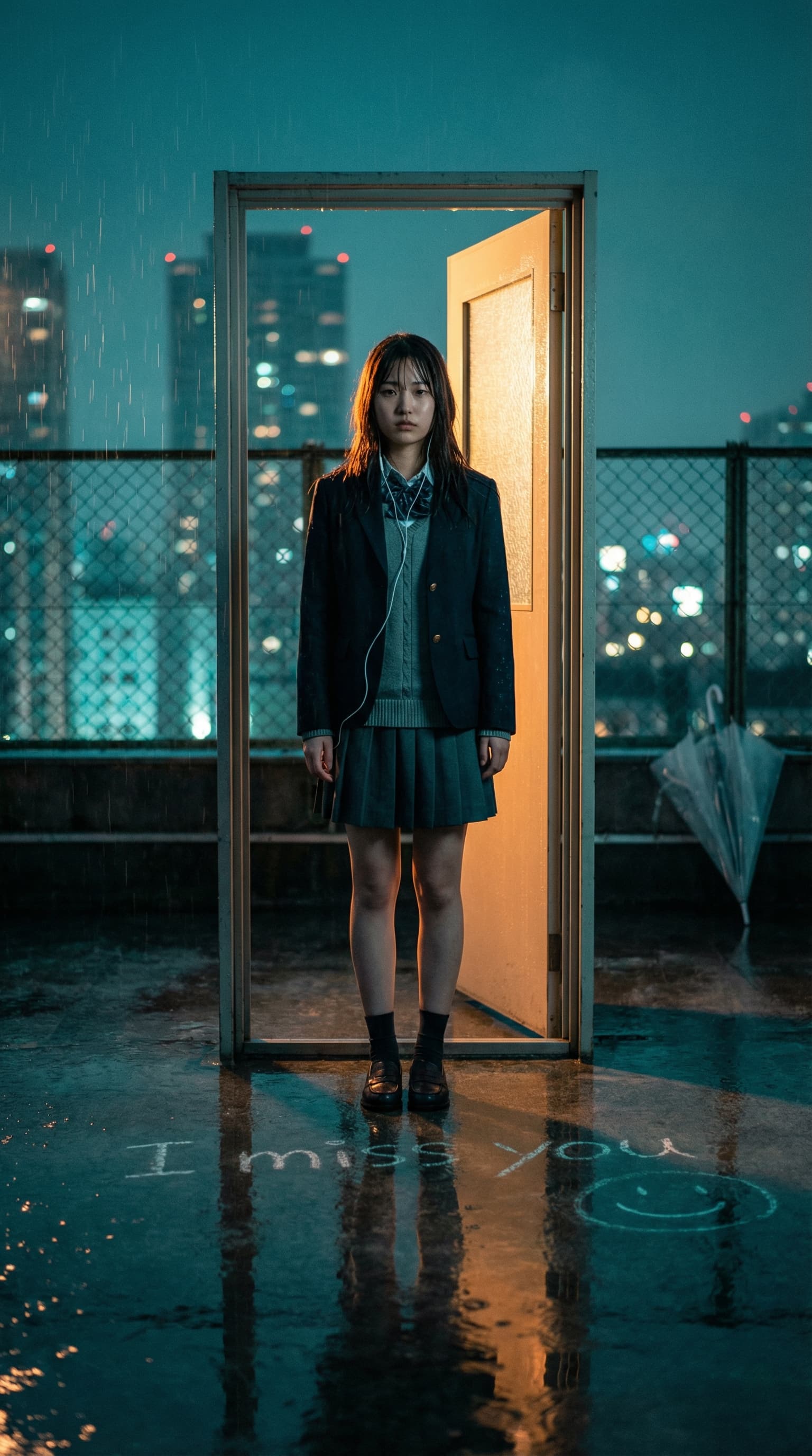 A student stands framed by a doorway on a rainy rooftop, her expression suggesting a quiet contemplation. The neon-li...