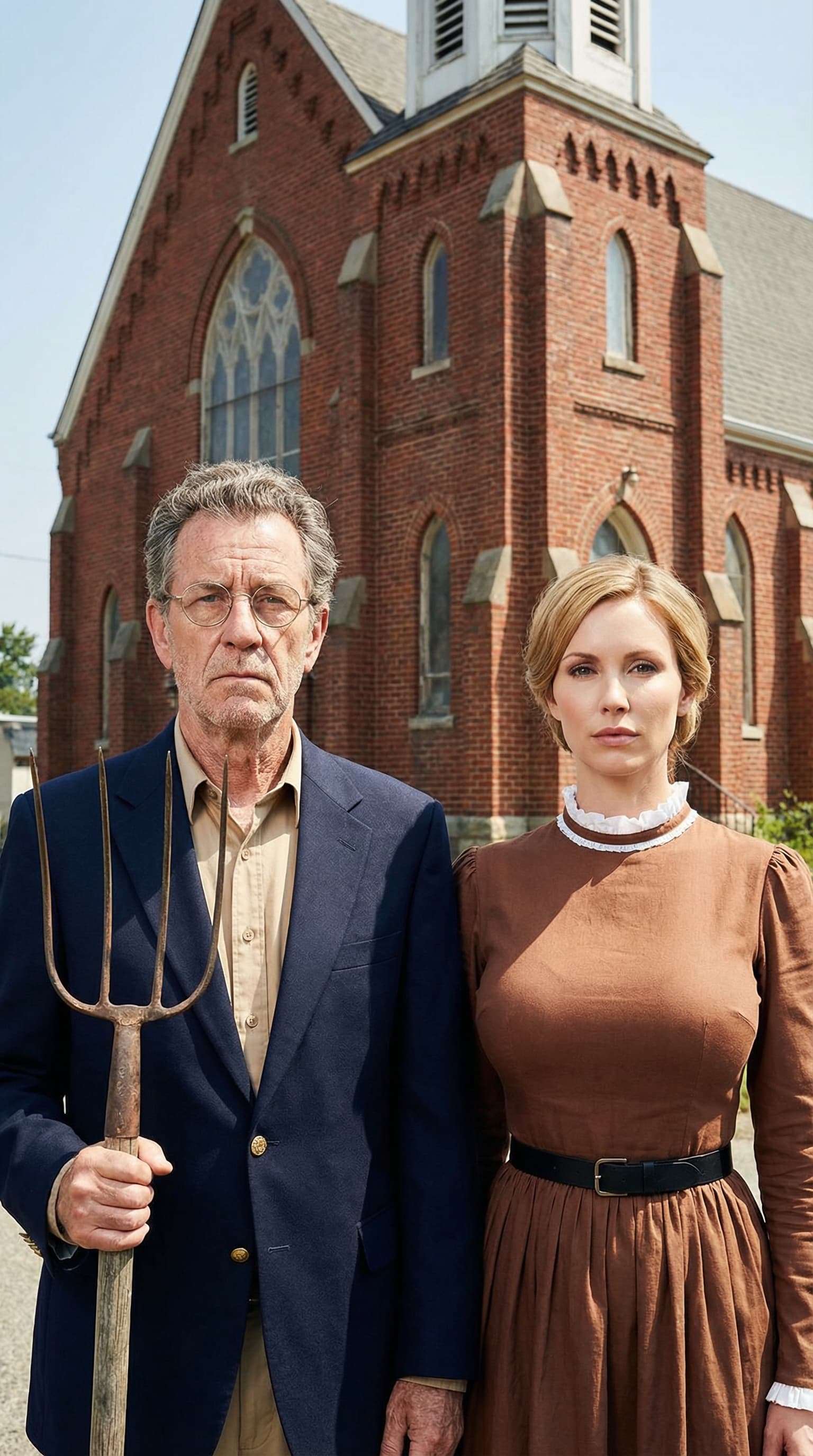 This image recreates Grant Wood's "American Gothic," placing the stoic farmer and his daughter before a rural church....