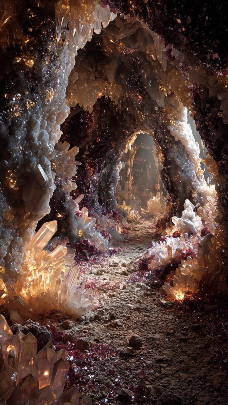 A vast, photorealistic Crystal Caverns - Gem Formation Cave unfolds before the c...