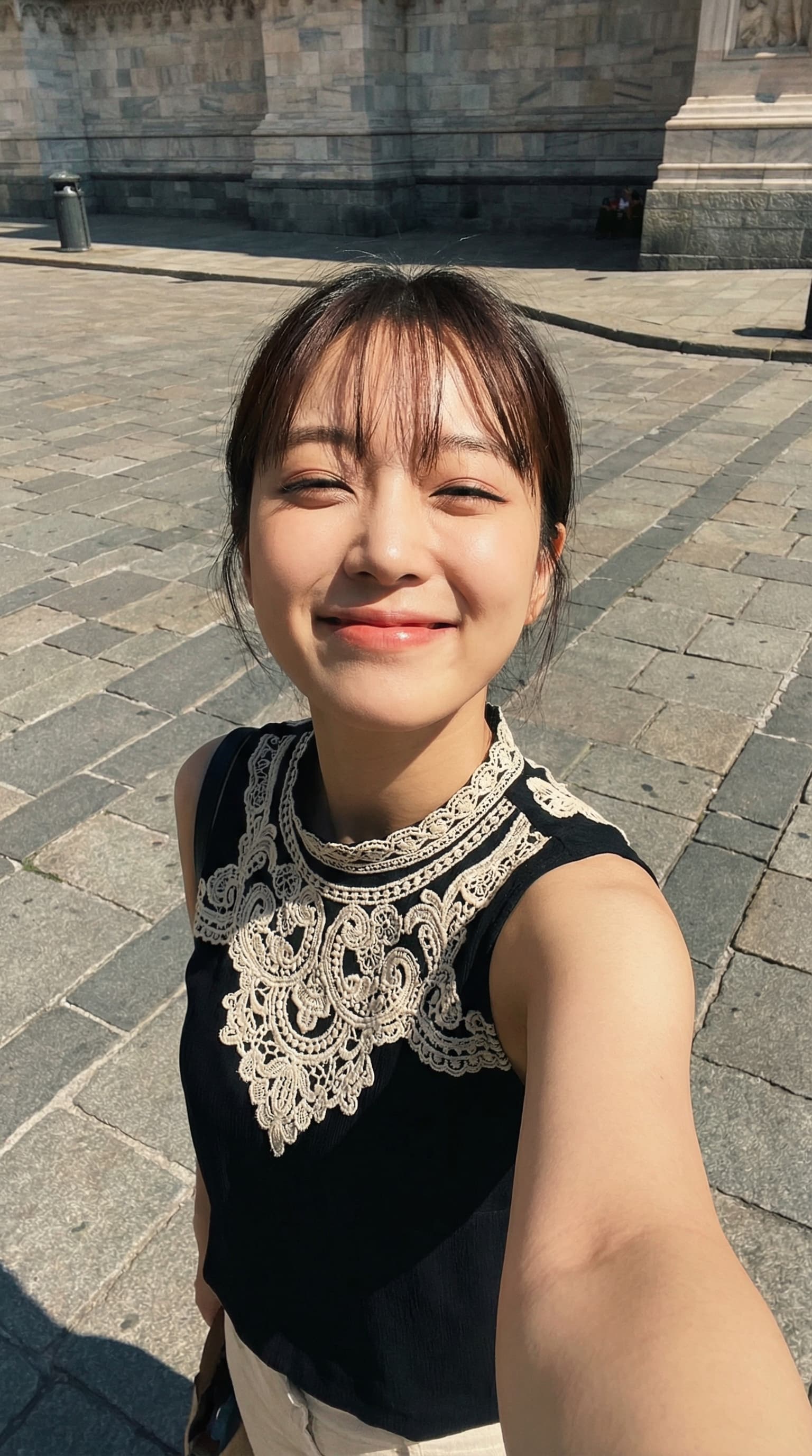 Sunlight bathes a smiling woman in a black top with elaborate lace detail. The background suggests a European plaza, ...
