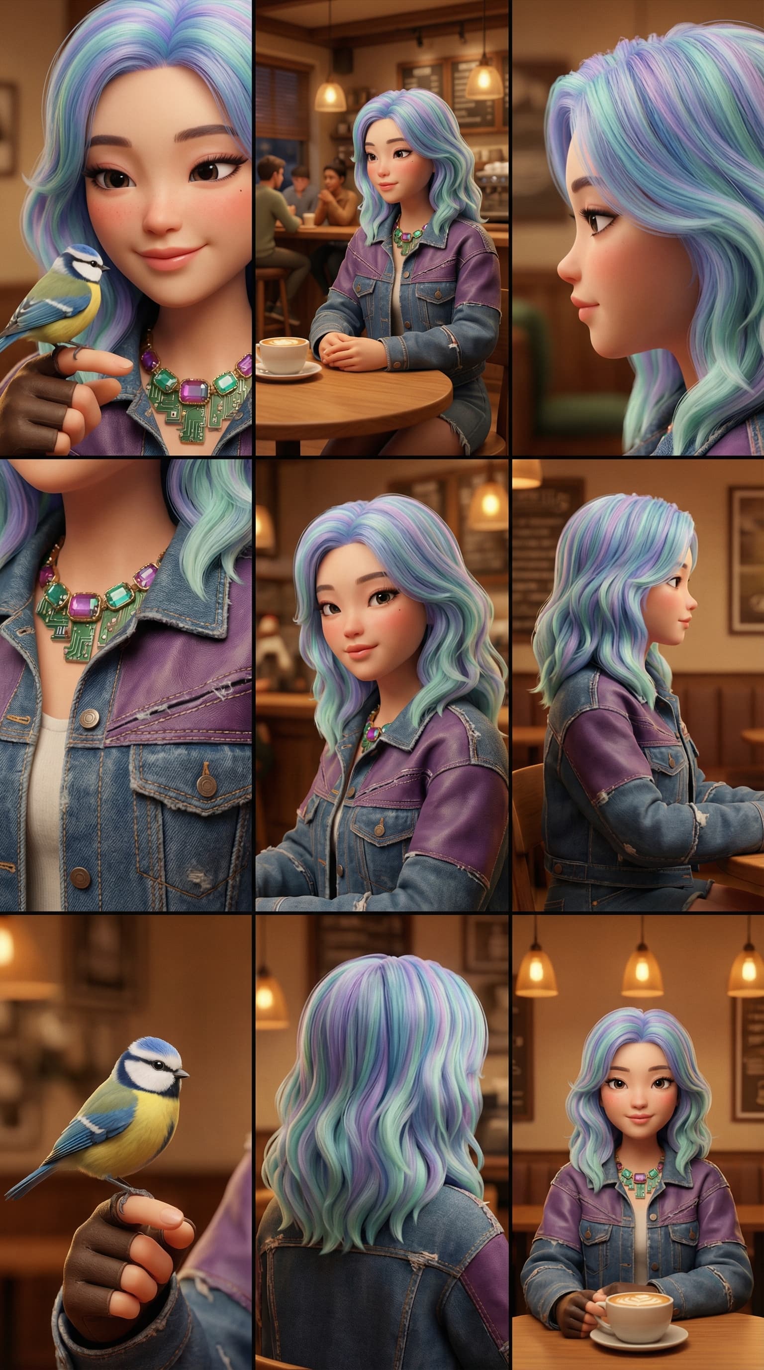 A digital illustration depicts a young woman with pastel blue and purple hair in a cozy café setting. The image showc...