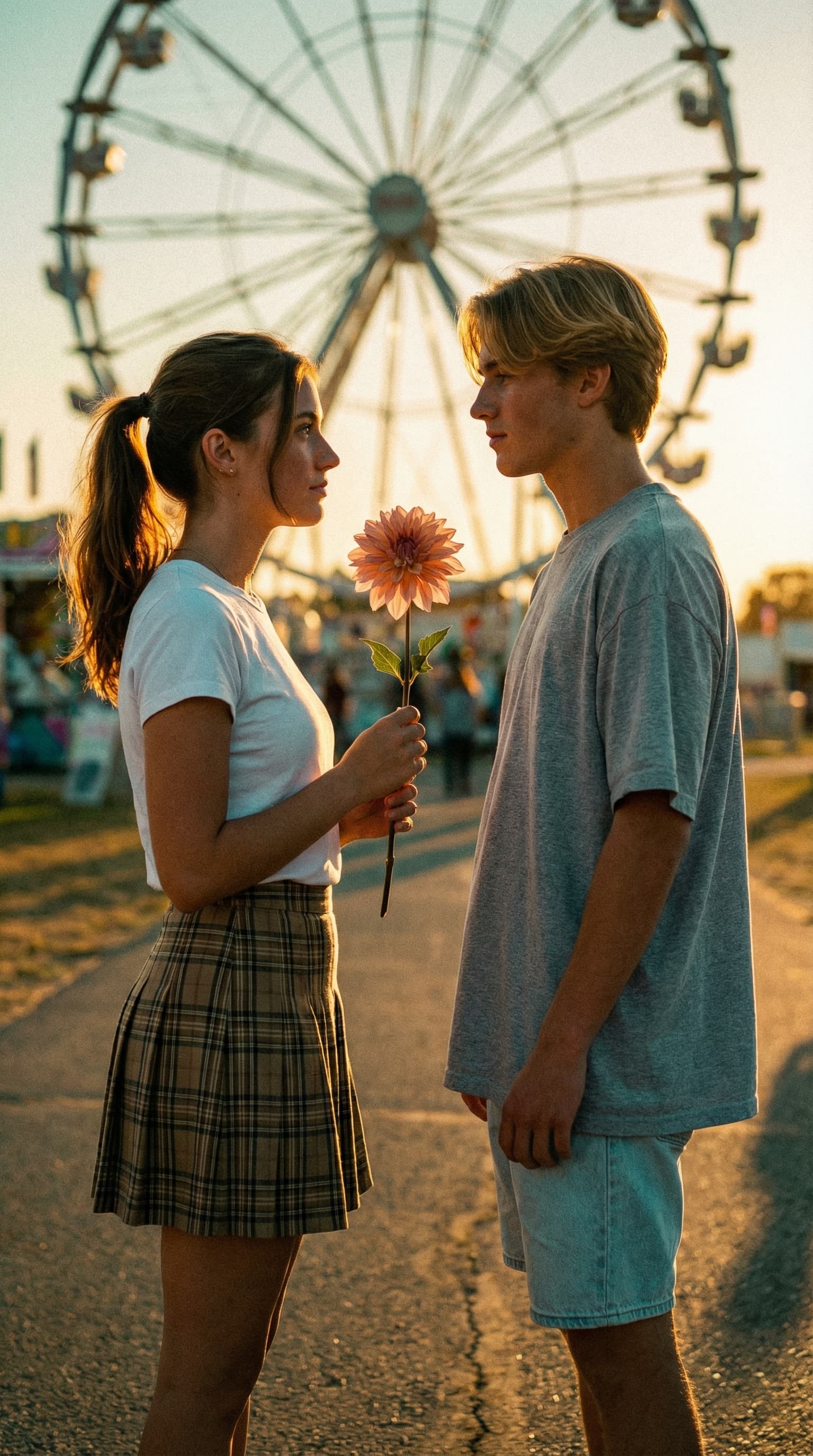 Bathed in the warm glow of a carnival sunset, two young figures stand face to face. A girl offers a single flower to ...