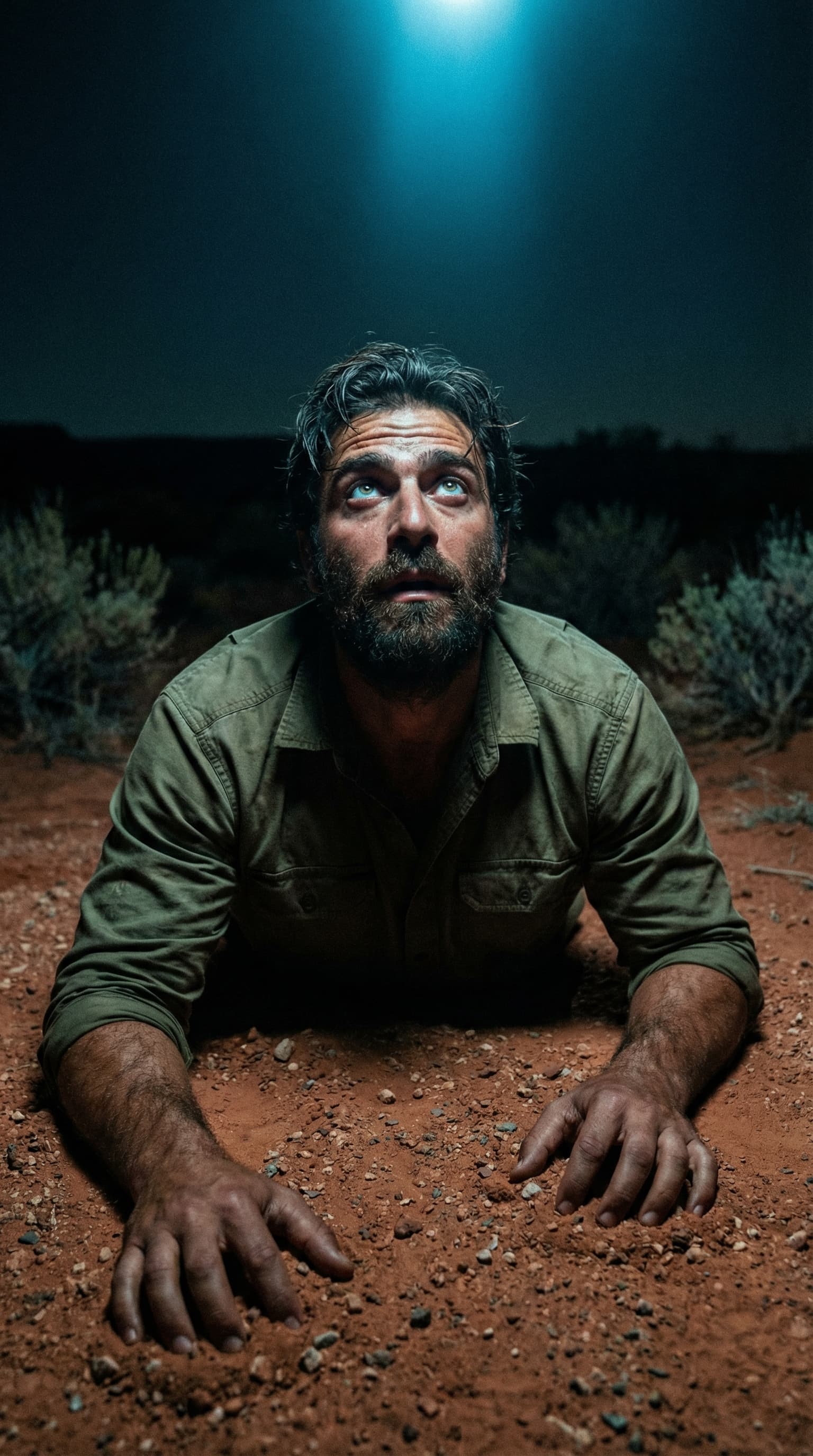 A bearded man in a green shirt lies prone on the desert floor, gazing upwards at a bright light in the dark sky. The ...