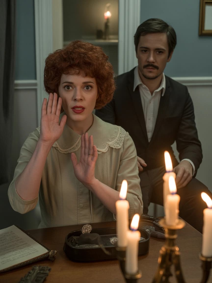 In this stylized portrait, a woman with fiery red hair sits at a candlelit table, her hand raised as if taking an oat...