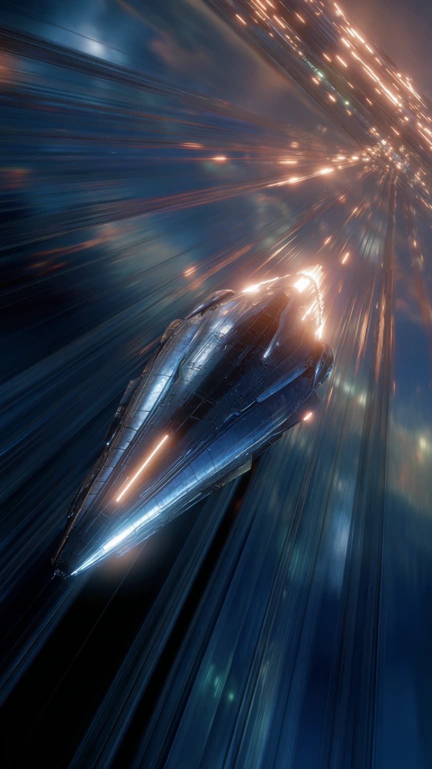 A futuristic solar sail ship glides through interplanetary space, its sleek, aer...