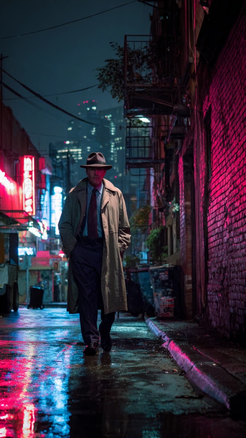 A neon-drenched alleyway stretches out like a canvas of contrasts, with the priv...