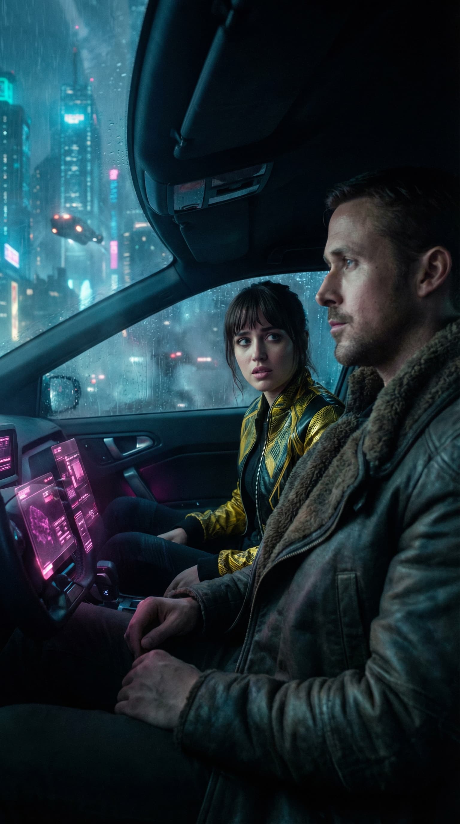 Inside a futuristic vehicle, a man and woman gaze outward at a rain-soaked cityscape filled with neon lights and flyi...
