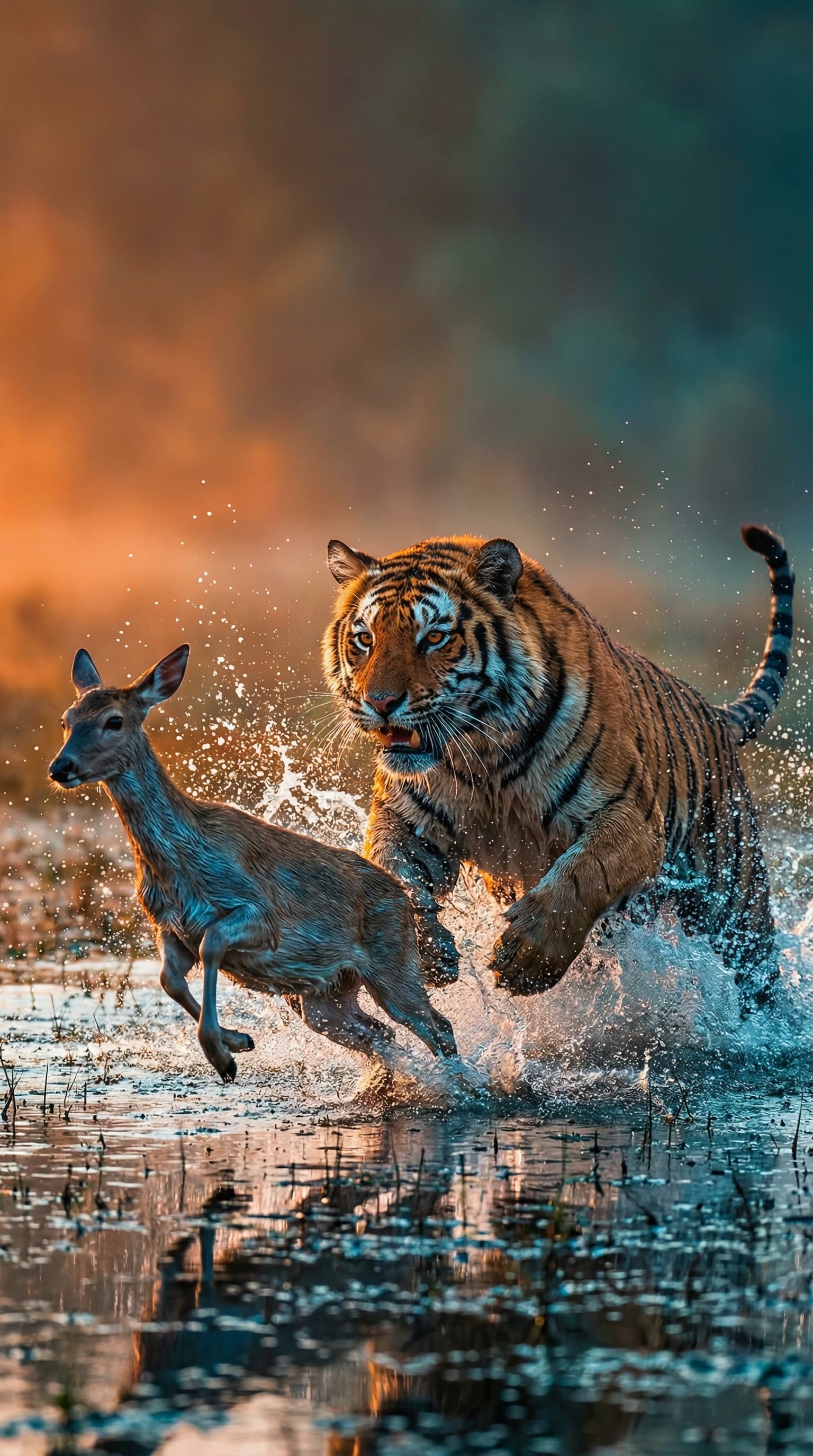 A dramatic encounter unfolds as a tiger chases a deer through shallow water, each animal captured mid-leap. Splashes ...