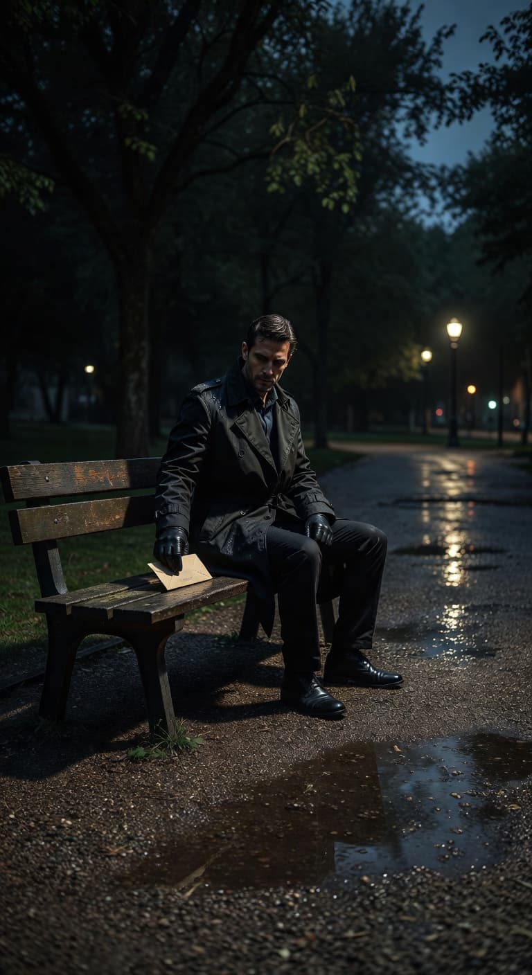 A figure sits on a park bench at night, a sealed envelope resting beside him. The somber mood is enhanced by the mute...