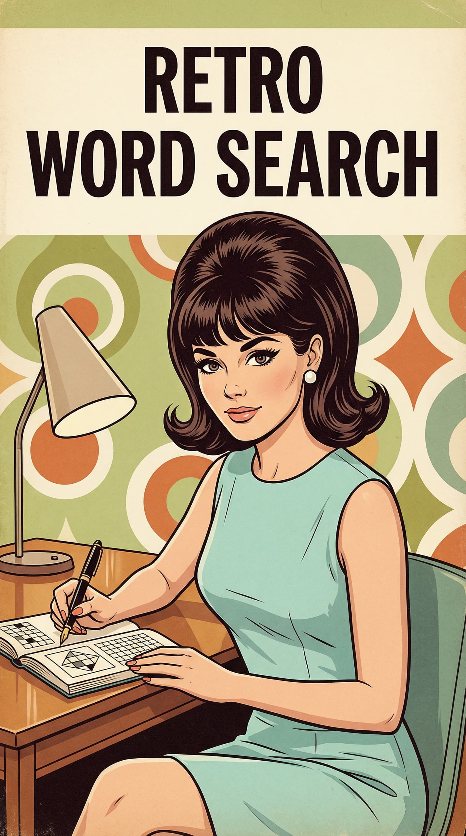 This retro-styled illustration depicts a woman working on a word search puzzle. The sett...